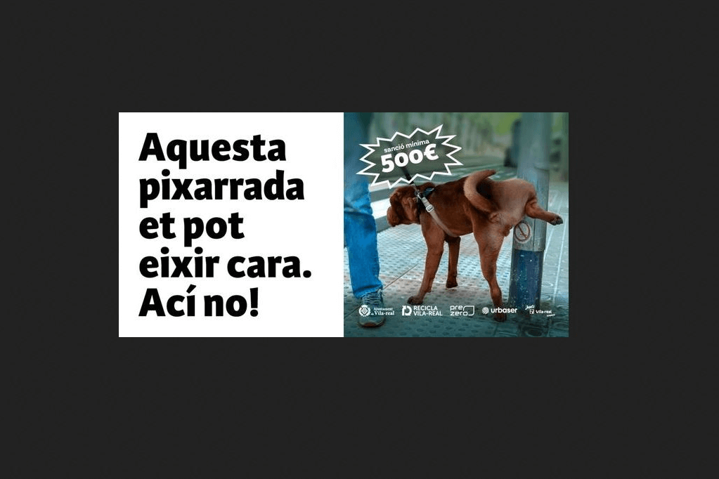 La campaña se ha iniciado con la viralización de un vídeo que forma parte de la iniciativa de concienciación a través de un ejemplo de denuncia a una persona, con el fin de pulsar la opinión ciudadana en redes sobre esta problemática. La campaña, que consta de diferentes fases, continúa ahora con la difusión en redes sociales de cartelería con los eslóganes de la campaña y la advertencia de que las sanciones pueden ser de hasta 500 euros. Además, esta cartelería también se instalará en soportes de publicidad exterior y en el Bus Groguet. Del mismo modo, se ha comenzado a hacer difusión de la campaña en la pantalla exterior del Ayuntamiento de Vila-real. En los próximos días se colocarán también pegatinas en las farolas para advertir de la prohibición de que los animales orinen en estos elementos del alumbrado público, ya que generan una corrosión grave que puede afectar incluso a la seguridad.