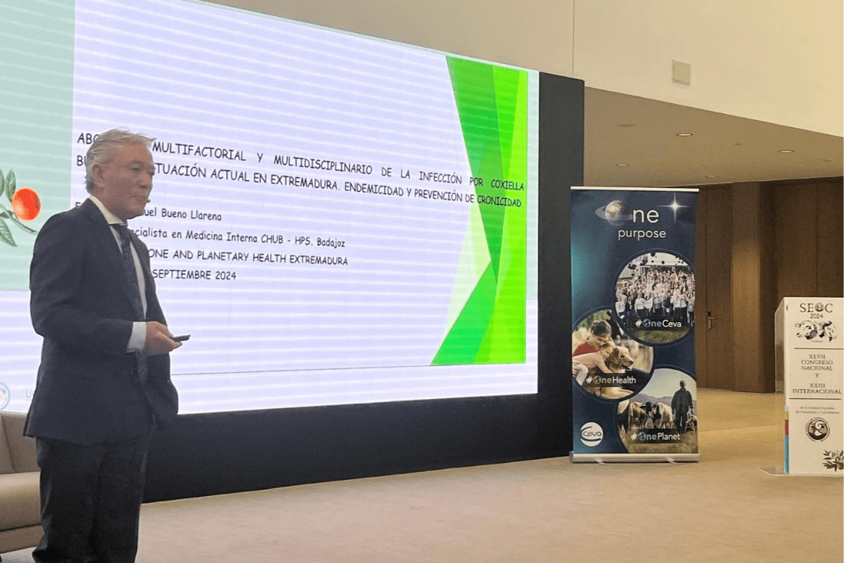 Ceva Salud Animal acompañó a los profesionales en la pasada edición del XLVII Congreso Nacional y XXIII Internacional de la Sociedad Española de Ovinotecnia y Caprinotecnia (SEOC 2024), del que además fue patrocinador prémium. Celebrado del 18 al 20 de septiembre en Valencia, la compañía organizó una jornada satélite que reunió a más de un centenar de veterinarios en torno a la fiebre Q. Lo hizo de un modo diferente, ameno y didáctico. El abordaje One Health de la sesión permitió analizar la enfermedad de un modo multidisciplinar, con profesionales de sanidad animal y humana. Vigilancia, prevención y control bajo el paraguas de Una Sola Salud son los pilares fundamentales de la lucha contra esta patología zoonótica causada por Coxiella burnetii que afecta tanto a animales como a humanos.
