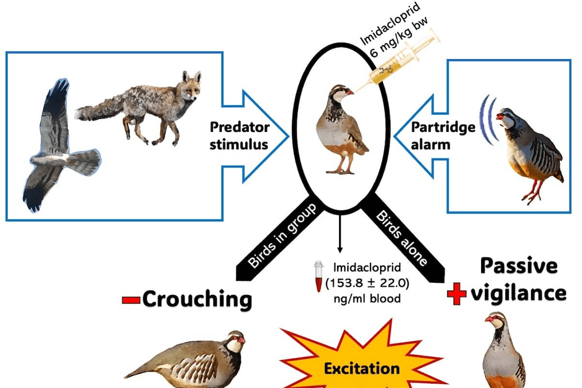 En los experimentos con perdices en grupo, los resultados del estudio muestran que el tiempo durante el que las perdices permanecieron inmóviles y agachadas frente a la amenaza del depredador fue menor en las aves tratadas con una dosis de 6 mg de imidacloprid por kilogramo de peso corporal que en las aves control (no tratadas). Por su parte, en los experimentos con perdices individuales, la vigilancia pasiva frente a la alarma intraespecífica duró más tiempo en las perdices tratadas con 6 mg/kg de imidacloprid que en las perdices no tratadas. De forma general, estos resultados muestran hiperreactividad o mayor nerviosismo ante la amenaza depredadora después de una exposición subletal a imidacloprid, lo que puede tener consecuencias en la supervivencia en condiciones de campo, ya que hace al animal más visible para los depredadores.