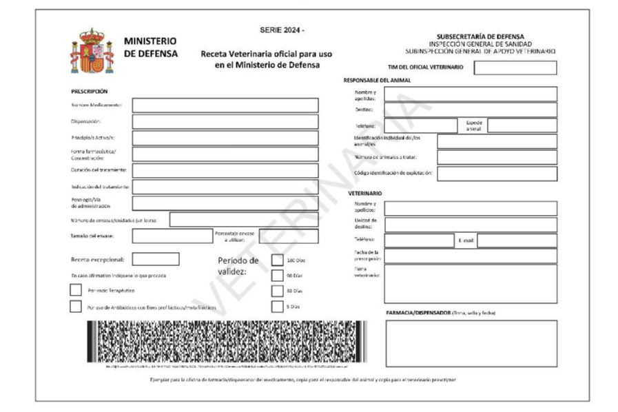 El Ministerio de Defensa ha aprobado un nuevo modelo oficial de receta veterinaria para su uso exclusivo en las Fuerzas Armadas. La resolución, publicada el 27 de diciembre de 2024 en el Boletín Oficial del Estado, establece un formato adaptado a las exigencias del Real Decreto 666/2023, que regula la ...