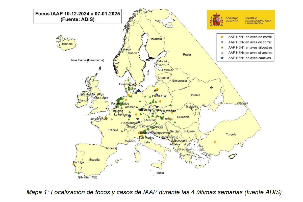 En España, la circulación del virus en la actual temporada y hasta la fecha sigue siendo limitada, no habiéndose detectado ningún caso de IAAP H5N1 en aves de corral, si bien el programa de vigilancia implementado por las CCAA ha permitido la detección, desde el pasado 1 de julio de 2024, de un total de 20 casos en aves silvestres (principalmente distintas especies de gaviotas) y 1 en aves cautivas en las Comunidades Autónomas de Galicia (19), Castilla y León (1) y Cataluña (1).