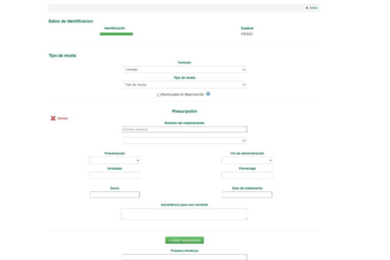 A través de este módulo, los veterinarios podrán acceder a RAIA y seleccionar al animal para el que desean realizar una prescripción. En el menú de opciones, aparecerá una nueva función denominada "crear receta", que abre un formulario donde se completan automáticamente los datos del animal, el propietario y el veterinario prescriptor. No obstante, será posible modificar el correo electrónico y el número de teléfono móvil al que se enviará el código de la receta para su dispensación y consulta.