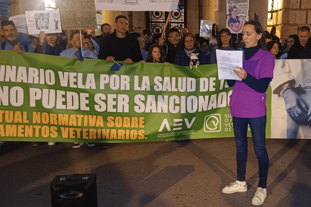 Tras una pancarta de cabecera con el esclarecedor eslogan "El veterinario vela por la salud de todos. Eso no puede ser sancionado. No a la normativa sobre medicamentos veterinarios", alrededor de un millar de veterinarios llegados de las tres provincias valencianas se han manifestado esta tarde por las calles de Valencia en protesta contra la restrictiva regulación del medicamento impuesta por el Gobierno. La convocatoria realizada por la Asociación Empresarial Veterinaria de Valencia (AEVETVAL) ha sido secundada por los tres colegios provinciales (ICOVV -Valencia-; Icoval -Alicante- y COVCS -Castellón) así como por la totalidad de entidades representativas del colectivo, como la Asociación de Veterinarios Especialistas en Pequeños Animales (AVEPA), la Asociación de Veterinarios Especialistas en Équidos (AVEE) y la Asociación Empresarial de Veterinarios Clínicos de la Provincia de Alicante (AEVA) y la Asociación de Veterinarios Especialistas Diplomados de España (AVEDE). Durante el recorrido se han sumado, además, multitud de representantes de entidades protectoras y animalistas además de otros tantos titulares de animales de compañía que han querido solidarizarse con la causa. Como recoge el manifiesto leído, ya en la plaza del Ayuntamiento de Valencia por la presidenta de AEVETVAL, Rut Zuriaga, la actual regulación en materia de medicamentos veterinarios, "está encareciendo los tratamientos y provocando muchos problemas que afectan tanto a los profesionales del sector como al bienestar y la salud de los animales".