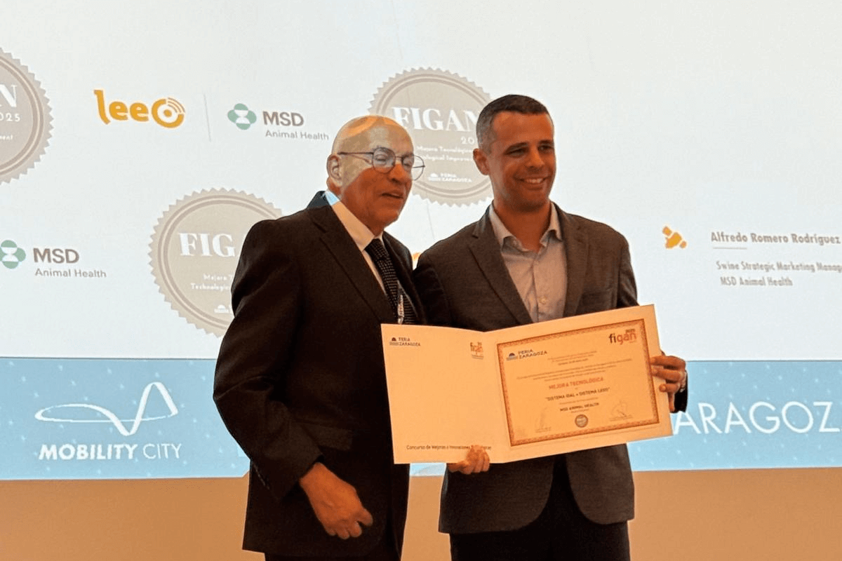 Durante la gala de entrega de premios, celebrada en Zaragoza este miércoles 26 de marzo en el marco de la 17ª edición de FIGAN, se otorgó a MSD Animal Health el reconocimiento en la categoría de Mejora Tecnológica, siendo João Calado, director de los equipos de Porcino y Avicultura en MSD Animal Health España, la persona encargada de recibir la distinción.