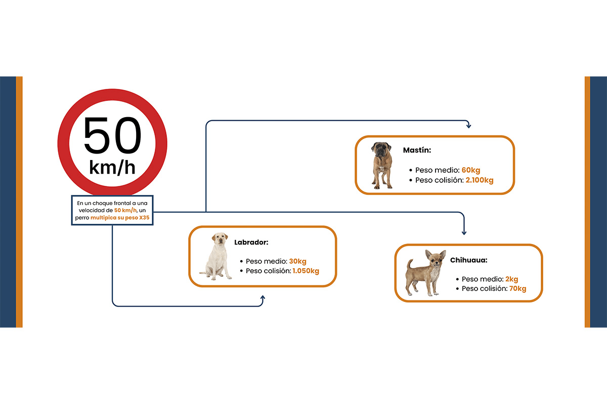 Así, si un perro que pesa 30 kilogramos viaja suelto, en caso de producirse un choque frontal (por impacto del coche contra otro vehículo o contra cualquier otro tipo de objeto) a la velocidad indicada, el animal multiplicaría su peso hasta los 1.050 kg. Esto provocaría que el perro fuera lanzado como un proyectil en el interior del coche, una situación que pondría en riesgo su propia vida y la del resto de ocupantes humanos.