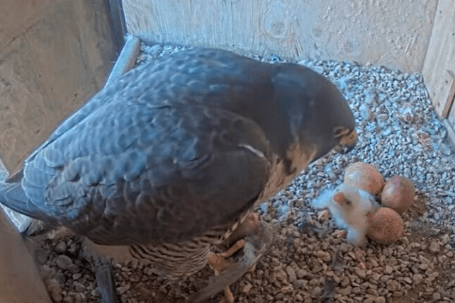 En las imágenes, que pueden verse a través de la cámara en directo instalada en el nido, puede observarse cómo el macho de halcón peregrino lleva comida a la hembra, principalmente pequeñas aves, que le sirven para alimentarse a sí misma y al polluelo. Mientras tanto, sigue incubando los tres huevos restantes, que eclosionarán en los próximos días.