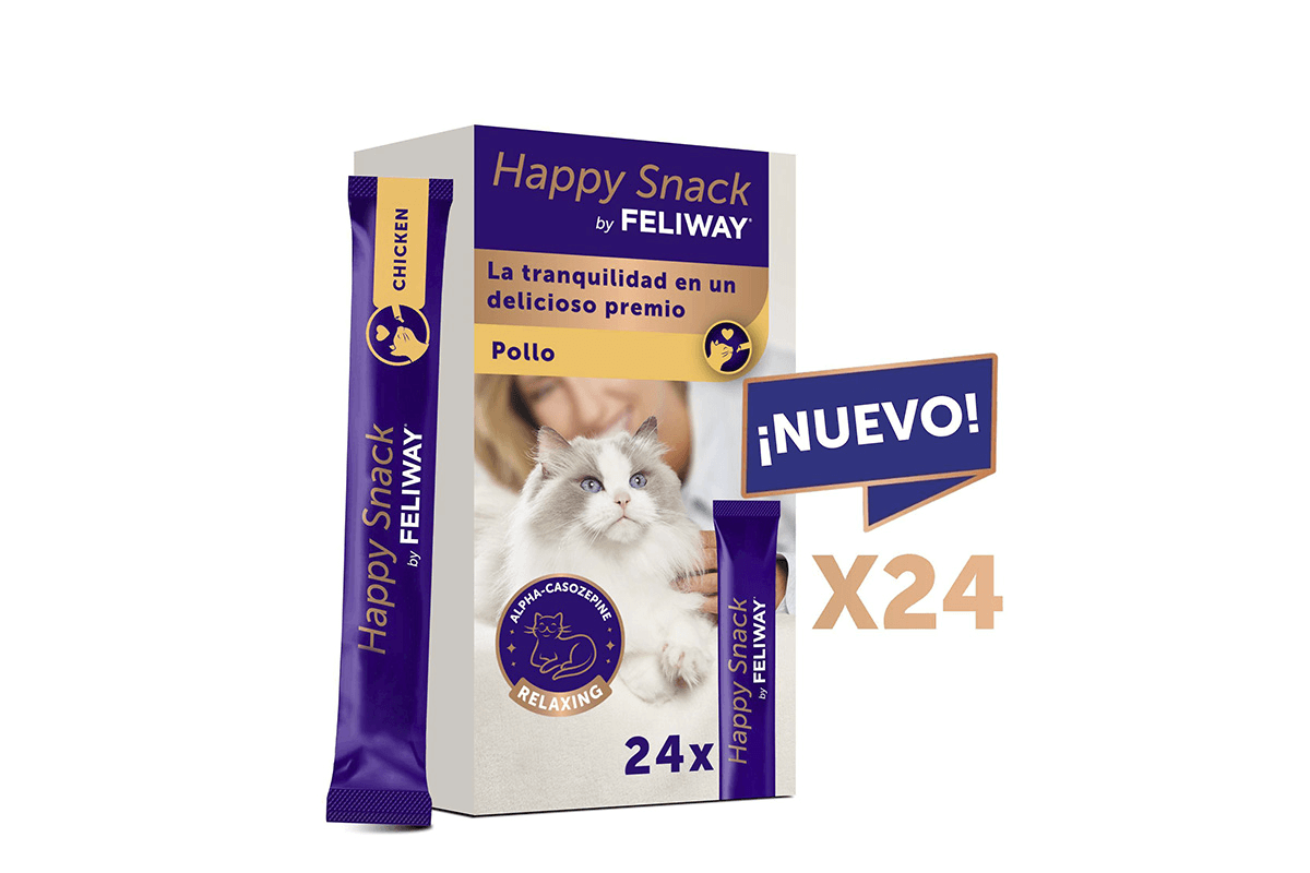 Esta gama premium y única es parte de FELIWAY®, marca líder en bienestar felino y recomendada por veterinarios. Happy Snack by FELIWAY® es un ligero, cremoso y delicioso premio con sabor a pollo que contiene alfa-casozepina, una proteína natural de la leche con propiedades relajantes que ayuda a que los gatos gestionen mejor los momentos de estrés, permite crear un hábito relajante y contribuye a reforzar el vínculo humano-animal. Por ello, es ideal para gatos que salen al exterior, en viajes y visitas al veterinario o como distractor durante la consulta.
