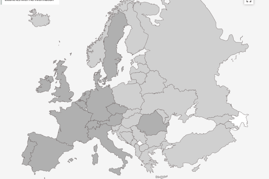 Sin regulación: Albania, Armenia, Bielorrusia, Bosnia y Herzegovina, Bulgaria, Croacia, Chipre, Estonia, Finlandia, Georgia, Grecia, Hungría, Islandia, Letonia, Lituania, Luxemburgo, Moldavia, Montenegro, Macedonia del Norte, Noruega, Polonia, Rusia, Serbia, Eslovaquia, Eslovenia, Turquía y Ucrania