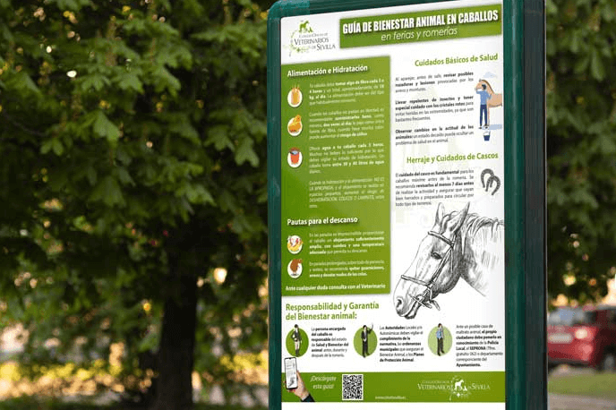 Por este motivo, desde la entidad colegial hemos distribuido en la época previa a El Rocío a todos los ayuntamientos de la provincia de Sevilla que tienen firmado un convenio de colaboración con la corporación veterinaria, y a las hermandades involucradas en las mismas, un cartel a modo de a modo de "Guía para asegurar el Bienestar Animal en los caballos en las ferias y romerías" (descargar cartel) junto con un díptico informativo (descargar díptico) con una serie de pautas y consejos veterinarios sobre aspectos relacionados con la correcta alimentación e hidratación, alojamiento y descanso, cuidados básicos de salud, higiene y cuidado de cascos y herraje, además de otra documentación adicional que hemos difundido a través de Redes Sociales y el Canal de WhatsApp de la entidad colegial.