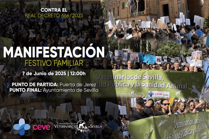 En la provincia de Sevilla hemos convocado una MANIFESTACIÓN VETERINARIA festivo familiar de 2 horas, el próximo sábado 7 de junio de 12:00 a 14:00 horas. El itinerario irá desde Puerta de Jerez, Avenida de la Constitución 40-1, hasta Plaza Nueva, frente al Ayuntamiento de Sevilla,