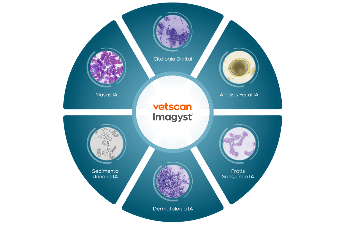 Con esta última novedad, Vetscan Imagyst® se convierte en la única herramienta de diagnóstico veterinario comercialmente disponible de su clase que ofrece seis aplicaciones de prueba únicas en un diseño compacto de sobremesa: IA Masas, Citología Digital, Sedimento Urinario con IA, Fecal con IA, Dermatología con IA y frotis sanguíneo con IA.