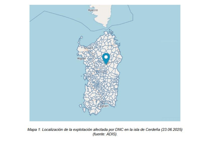 Los Servicios Veterinarios Oficiales (SVO) de Italia han notificado en ADIS el día 23/06/2025 un foco de Dermatosis Nodular Contagiosa (DNC) en la isla de Cerdeña, primera detección de la enfermedad en el país, tras el hallazgo animales con síntomas y lesiones compatibles, en una granja de ganado bovino localizada entre los municipios de Nuoro y Orania, en la provincia de Nuoro, en el centro de la isla (ver mapa 1).