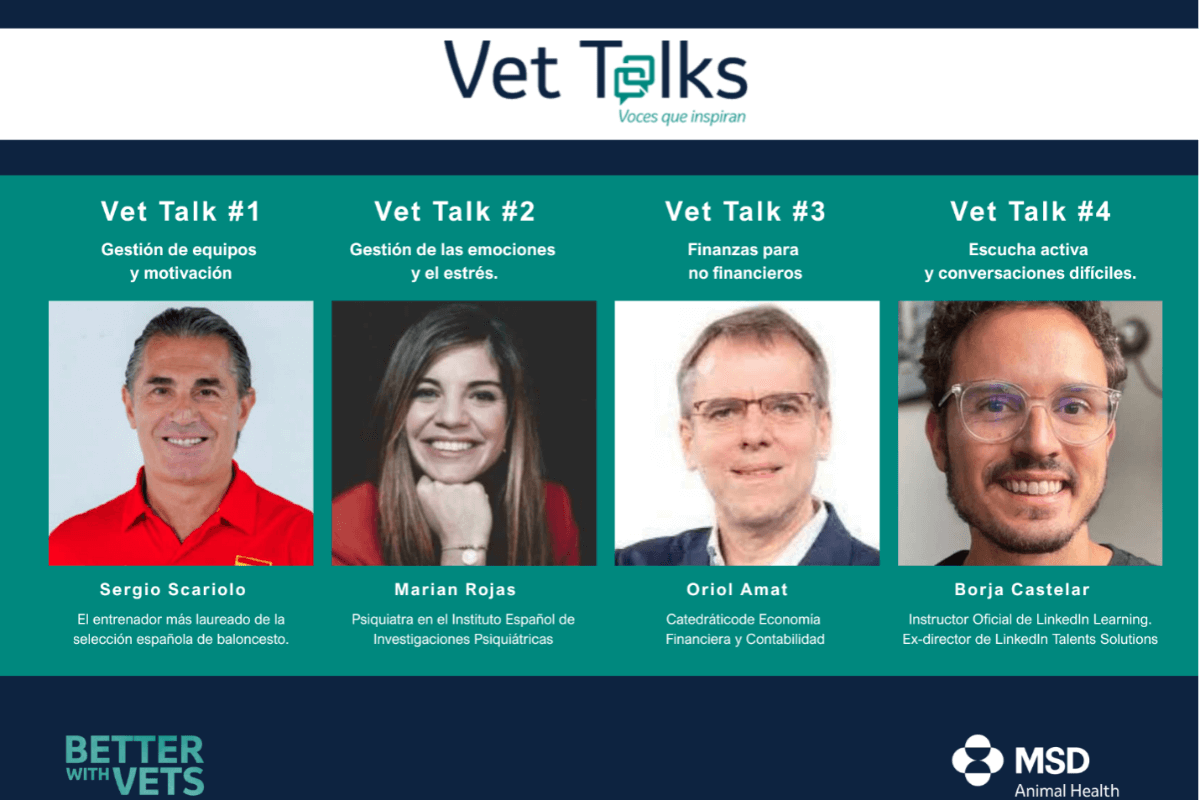 MSD Animal Health continúa impulsando acciones centradas en los veterinarios en el marco de su campaña "Better with Vets" mediante el ciclo de conferencias "VetTalks: voces que inspiran", una serie de charlas diseñadas exclusivamente para veterinarios y sus equipos, donde se abordan temáticas cruciales como la gestión de equipos y la motivación, la gestión de emociones y el stress (salud mental), las finanzas para no financieros o la escucha activa y conversaciones difíciles.