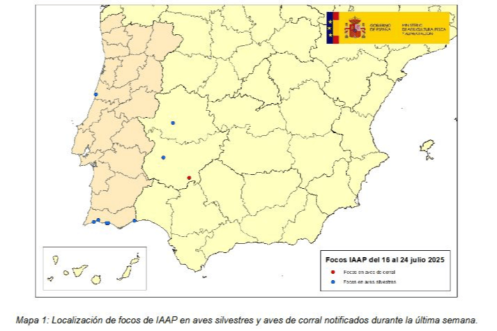 Durante la última semana, se ha detectado circulación de IAAP en aves silvestres en el sur de Portugal, cerca de la frontera con España, por lo que, se recuerda nuevamente la necesidad de mantener y reforzar las adecuadas medidas de bioseguridad en las explotaciones avícolas, particularmente en el suroeste peninsular, para evitar el contacto directo o indirecto con aves silvestres, así como reforzar la vigilancia pasiva tanto en aves silvestres, como en explotaciones avícolas, notificando a los Servicios Veterinarios Oficiales (SVO) cualquier sospecha de enfermedad, en particular, en el caso de aves domésticas por detección de caídas de consumo de agua y/o pienso, reducción de puesta de huevos, por presencia de mortalidad anormalmente elevada, o por observación de otros síntomas clínicos compatibles con la enfermedad. Ver el mapa 1 con la localización de los casos de IAAP en aves silvestres y aves de corral notificados del 16 a 24 de julio.