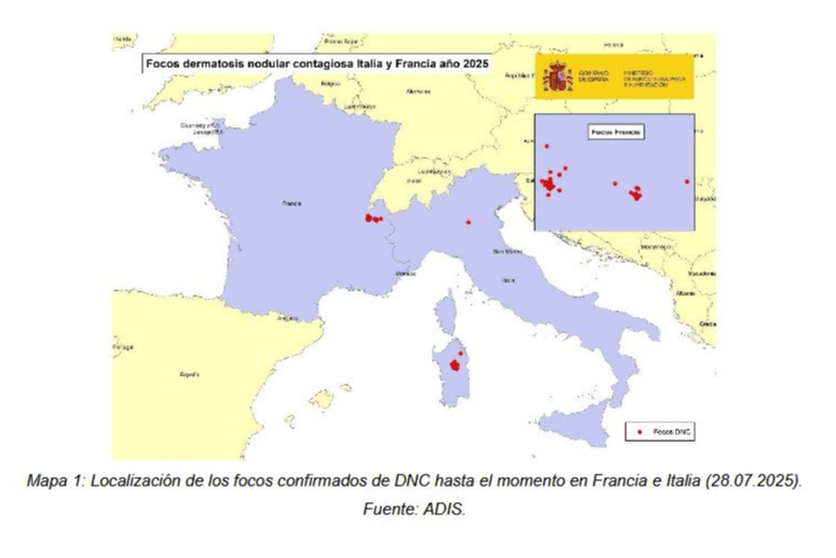 Desde la última comunicación emitida por el MAPA, los Servicios Veterinarios Oficiales (SVO) de Francia han notificado doce focos más de Dermatosis Nodular Contagiosa (DNC), dos de ellos en el departamento de Saboya y diez focos en el departamento colindante de Alta-Saboya (ver mapa 1), lo que hace un total ...