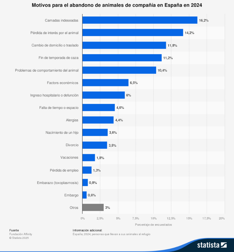 El informe recoge otros motivos menos comunes como los problemas de comportamiento animal (10,4%), factores económicos (6,5%), ingreso hospitalario o defunción del dueño (6%), falta de tiempo o espacio (4,6%), alergias (4,4%), el nacimiento de un hijo (3,6%) o el divorcio de la pareja (3,5%).