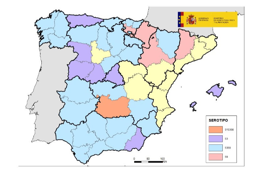 Durante la presente temporada de actividad vectorial, desde el 1 de abril de 2025, los laboratorios regionales de sanidad animal y el Laboratorio Central de Veterinaria (LCV) de Algete, laboratorio nacional de referencia para esta enfermedad, han confirmado la presencia de la enfermedad en las provincias y Comunidades Autónomas de Andalucía, Extremadura, Toledo, Ciudad Real, Murcia, Madrid, Burgos, Ávila, Segovia, León, Soria, Salamanca, Zamora, Palencia, Galicia, Asturias, Cantabria, País Vasco, Navarra, La Rioja, Huesca, Mallorca, Zaragoza y Lleida con implicación de los serotipos 1, 3 y 8.