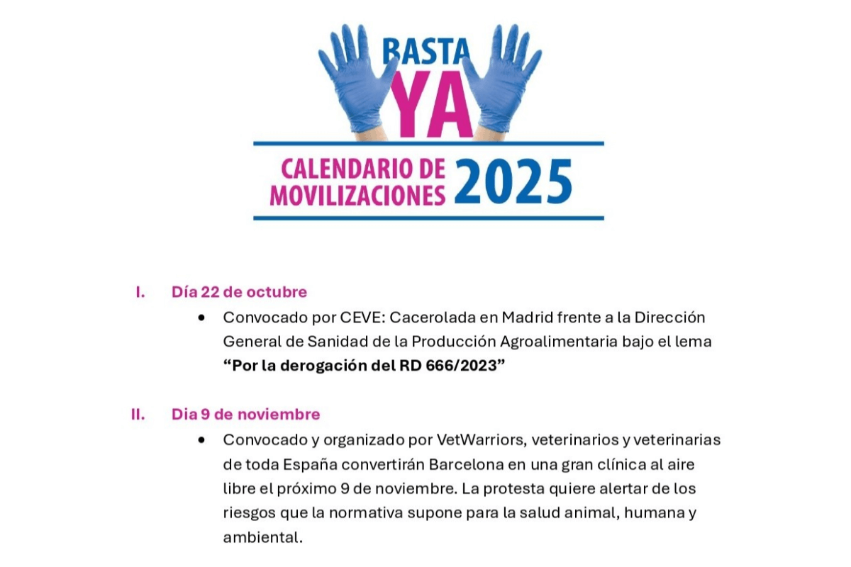 Posteriormente, el 9 de noviembre la asociación VetWarriors organizará en Barcelona una gran clínica al aire libre con la asistencia de veterinarios de toda España para "alertar de los riesgos que la normativa supone para la salud animal, humana y ambiental".