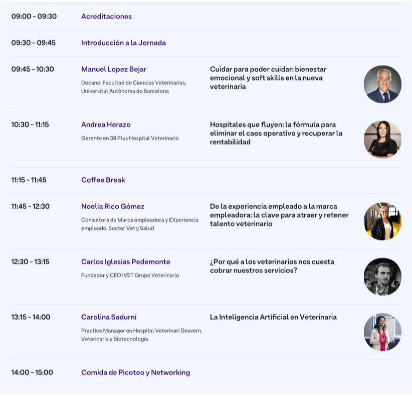 Una jornada práctica, con ponencias impartidas por referentes del sector que abordarán los retos más actuales de la profesión veterinaria:Programa y Ponentes¿A quién va dirigida?