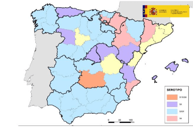 En el siguiente mapa se pueden ver las provincias en las que hasta el momento se han confirmado oficialmente focos de diferentes serotipos del virus de la lengua azul en la presente temporada.