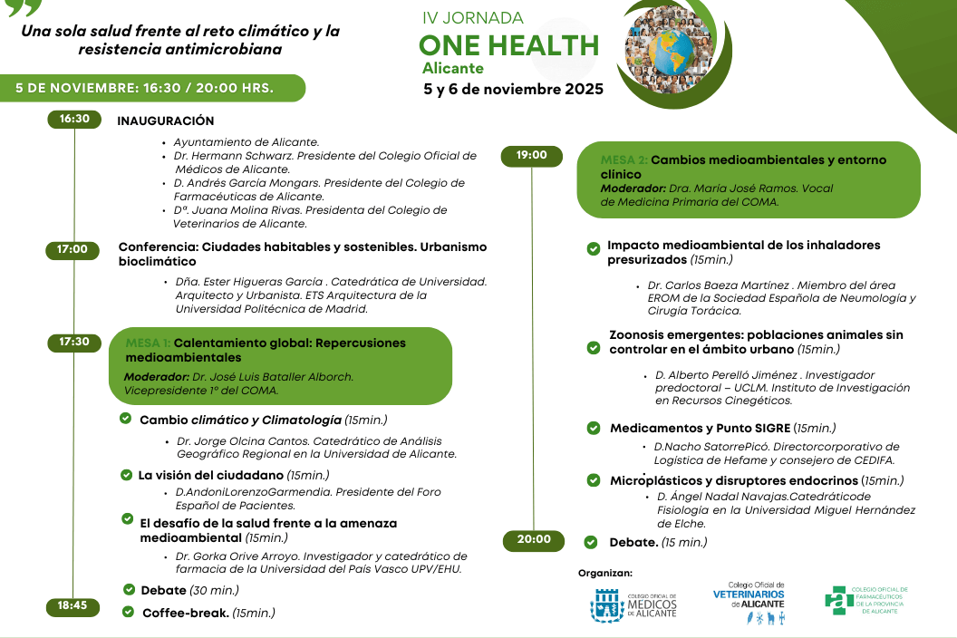 Entre los ponentes figuran especialistas de universidades, hospitales y plataformas científicas como la Plataforma One Health, además de responsables de salud pública y sanidad vegetal. La inauguración contará con representantes de los colegios sanitarios -entre ellos, la presidencia del Colegio de Veterinarios de Alicante- y la jornada ha sido declarada de Interés Sanitario por la Conselleria de Sanidad (resolución de 26/09/2025).