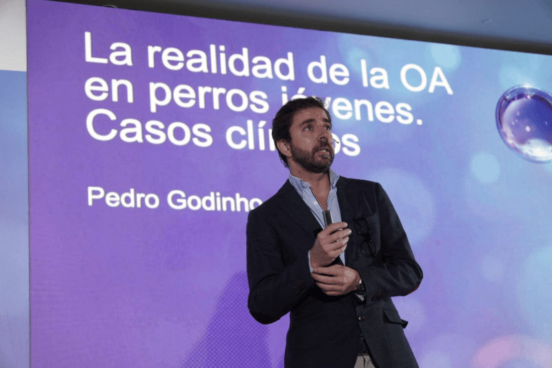 Acto seguido, Pedro Godinho profundizó en la realidad de la OA en perros jóvenes. Aparte de tratar el dolor, "hay que cambiar el futuro de los países". La claudicación y dolor, la inflamación y la efusión articular son características comunes a todos. El deber como veterinarios es intentar que los perros no necesiten tratamiento. Expuso las ventajas de una varización del eje mecánico de la extremidad en un caso clínico, para que deje de tener un desarrollo rápido de la enfermedad. Hay que desplazar las cargas y aliviar las cargas sobre las articulaciones.