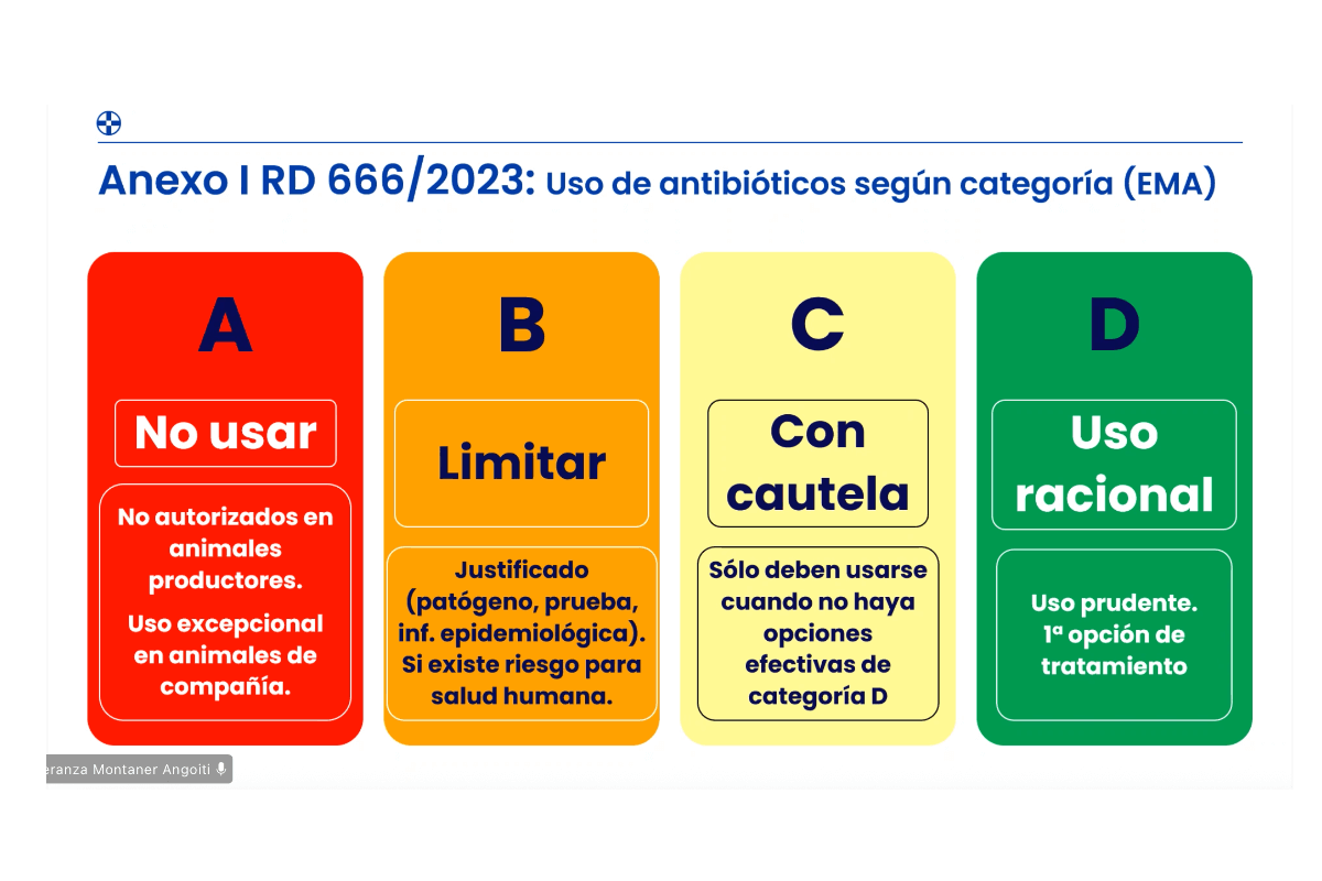 Los de categoría B hay que limitar al máximo su uso. "Sería como dentro de las opciones, la última a tener en cuenta. Y es que su uso tiene que estar muy justificado por el patógeno del que se trate, porque pueda ser un patógeno que ponga en riesgo también la salud humana. Y hay que basar esa prescripción en pruebas o en información epidemiológica que justifique la necesidad de hacer uso de estos antibióticos". Dentro de este grupo se encuentran las ceflosporinas de tercera y cuarta generación, polimisixnas o quinolonas.