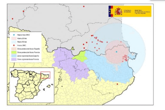 El foco se localiza en una explotación en régimen extensivo, con pastos de uso individual y un censo de 106 bovinos en la comarca Alt Empordà, en la provincia de Gerona. La  vacunación de la granja tuvo lugar el pasado mes de octubre, si bien, debido a la dificultad del manejo de este tipo de animales no se consiguió vacunar a la totalidad del censo, resultando 4 de los animales no vacunados positivos a la cepa de campo del virus de la DNC mediante PCR realizado en el Laboratorio Nacional de Referencia en Algete.