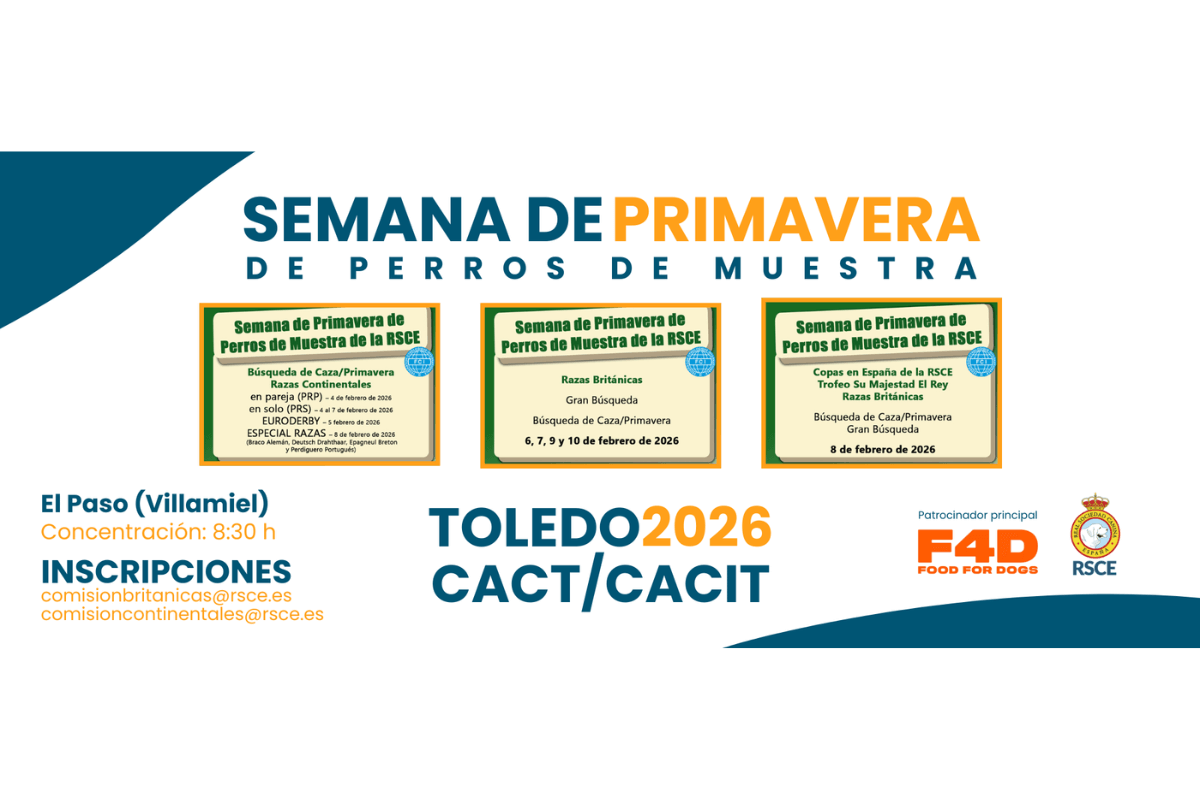 La Real Sociedad Canina de España (RSCE) organizará en la localidad toledana de Villamiel del 3 al 15 de febrero, la Semana de Primavera de Perros de Muestra, la gran cita anual de las pruebas de campo en España que marca el inicio de la agenda cinegética en nuestro país. La competición contará con la colaboración del Club Español del Braco Alemán (CEBA), Club Español del Deutsch Drahthaar (CEDD) y Pointer Club Español (PCE), y además se estrena con Food For Dogs como patrocinador.