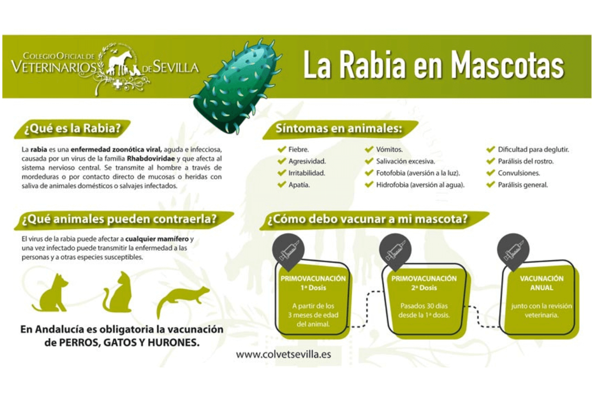 En Andalucía, la vacunación antirrábica es obligatoria en todos los perros, gatos y hurones antes de los 3 meses de edad, incluyendo la revacunación anual, y se considera la medida preventiva más eficaz frente a la infección ya que evita, además, la necesidad de administrar profilaxis postexposición.