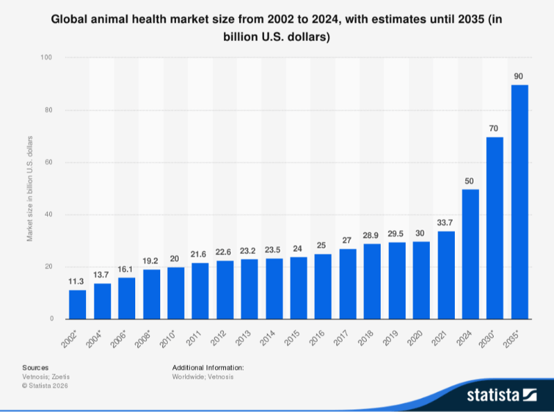 A pesar de que el mercado mundial de salud animal ya contaba con una tendencia al alza desde principios del siglo XXI, su crecimiento exponencial empezó a registrarse a partir de 2021. Ese año, el mercado ya marcaba un máximo histórico de 33.700 millones de dólares, un récord que en poco tiempo quedó superado por los ingresos experimentados en los últimos tres años. Entre 2021 y 2024, los ingresos del mercado han aumentado en más de 15.000 millones de dólares.