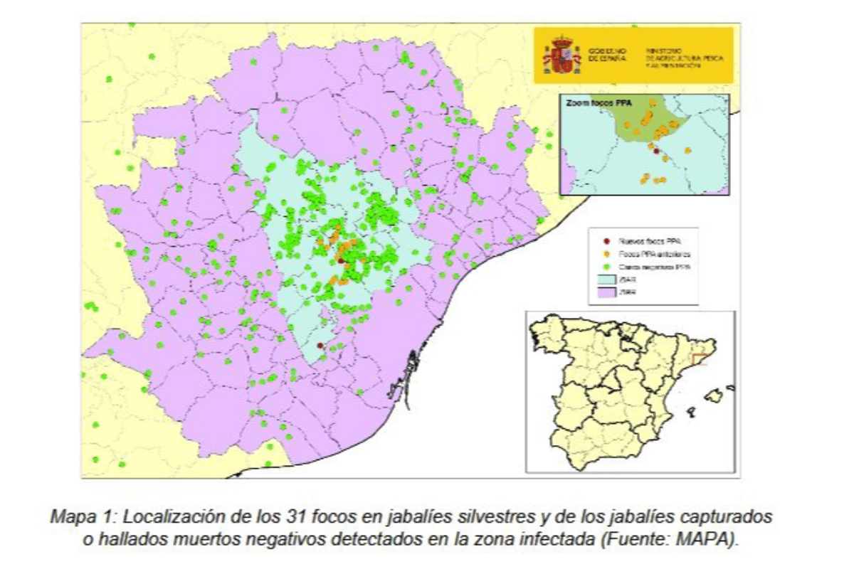 Además, se han analizado otros 1.112 casos que han resultado negativos, de los cuales 661 corresponden a animales capturados y 451 se han investigado por vigilancia pasiva (cadáveres enteros o restos hallados en el medio natural o animales con sintomatología abatidos) en la zona infectada y sus alrededores.