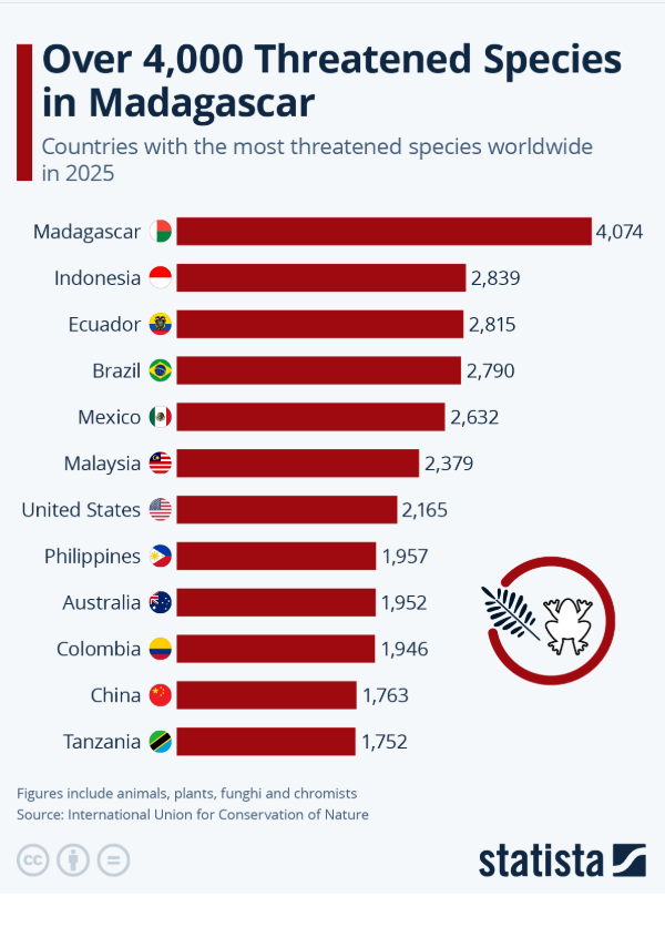 Los datos de la UICN señalan a Madagascar como el país del mundo que acapara el mayor número de especies de seres vivos —tanto animales como vegetales— en peligro de extinción. Madagascar, un santuario natural aislado frente a la costa africana, alberga miles de especies únicas en el planeta y más de 4.000 de ellas se encuentran amenazadas.