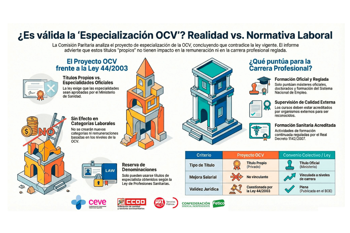 La Comisión Paritaria del Convenio Colectivo de Centros y Servicios Veterinarios, que preside la patronal CEVE, ha hecho público un informe en el que concluye que el proyecto de especialización promovido por la organización colegial veterinaria no se ajusta al marco normativo vigente y se ha impulsado sin la participación de los agentes sociales legítimamente representados en el ámbito laboral. El documento constata que ni sindicatos ni patronal han recibido comunicación oficial previa o posterior a la firma del acuerdo anunciado públicamente.