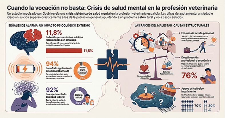 Los resultados de la encuesta también muestran que los problemas de salud mental entre los veterinarios son especialmente preocupantes, generalizados y muestran un patrón de malestar profundo. Más del 90 % de los profesionales sufre ansiedad relacionada con su trabajo y casi la mitad (46,5 %) la padece de forma frecuente o se encuentra actualmente en tratamiento.