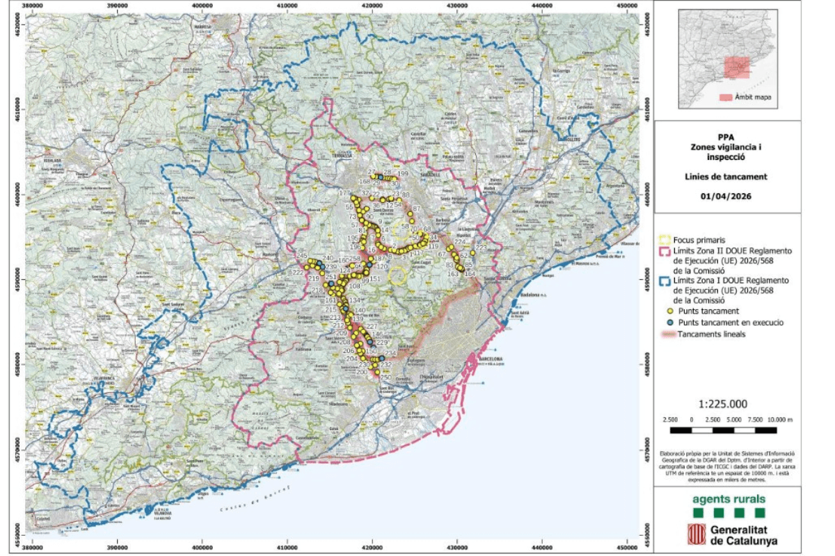 Desde la última nota de actualización de la situación de Peste Porcina Africana (PPA) enviada el 26 de marzo de 2026, los Servicios Veterinarios Oficiales (SVO) de la Generalitat de Catalunya han notificado la detección de un nuevo foco en jabalíes silvestres. Se trata de un foco que incluye un total de 3 casos en jabalíes hallados muertos en el medio natural en municipios incluidos en la zona restringida II dentro de la zona delimitada por los vallados perimetrales, en particular se trata de 2 casos en el municipio de Sant Cugat del Vallès y 1 caso en Sant Just Desvern.