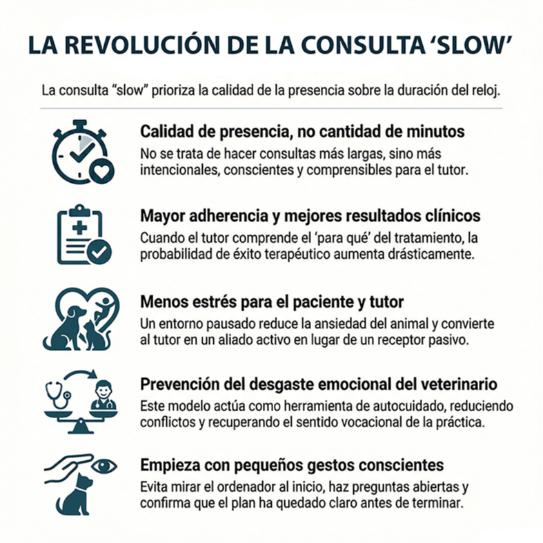 La experiencia clínica demuestra que muchas de las consultas repetidas, de las llamadas posteriores o de las visitas por problemas aparentemente no resueltos tienen su origen en una comunicación inicial incompleta. No porque el profesional no supiera qué hacer, sino porque no hubo espacio suficiente para asegurarse de que la información había sido realmente comprendida. La consulta lenta, paradójicamente, ahorra tiempo a medio y largo plazo. Reduce malentendidos, evita frustraciones y fortalece una relación que se traduce en fidelización y en una percepción más clara del valor del acto veterinario.