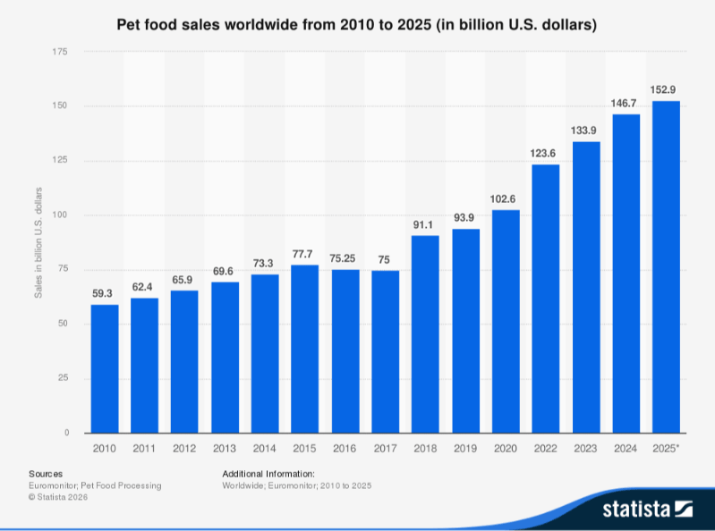 El auge de las mascotas parece no tener techo. Y la principal beneficiada de esta tendencia al alza es la industria de fabricación de alimentos para animales de compañía. Los datos son demoledores. Según el último estudio del medio especializado Pet Food Processing, el sector de producción de alimentos para mascotas registró en 2025 unas ventas récord valoradas en más de 152.000 millones de dólares. La cifra duplica a la de hace tan solo una década, cuando las ventas de alimentos para mascotas se quedaban en los 77.700 millones.