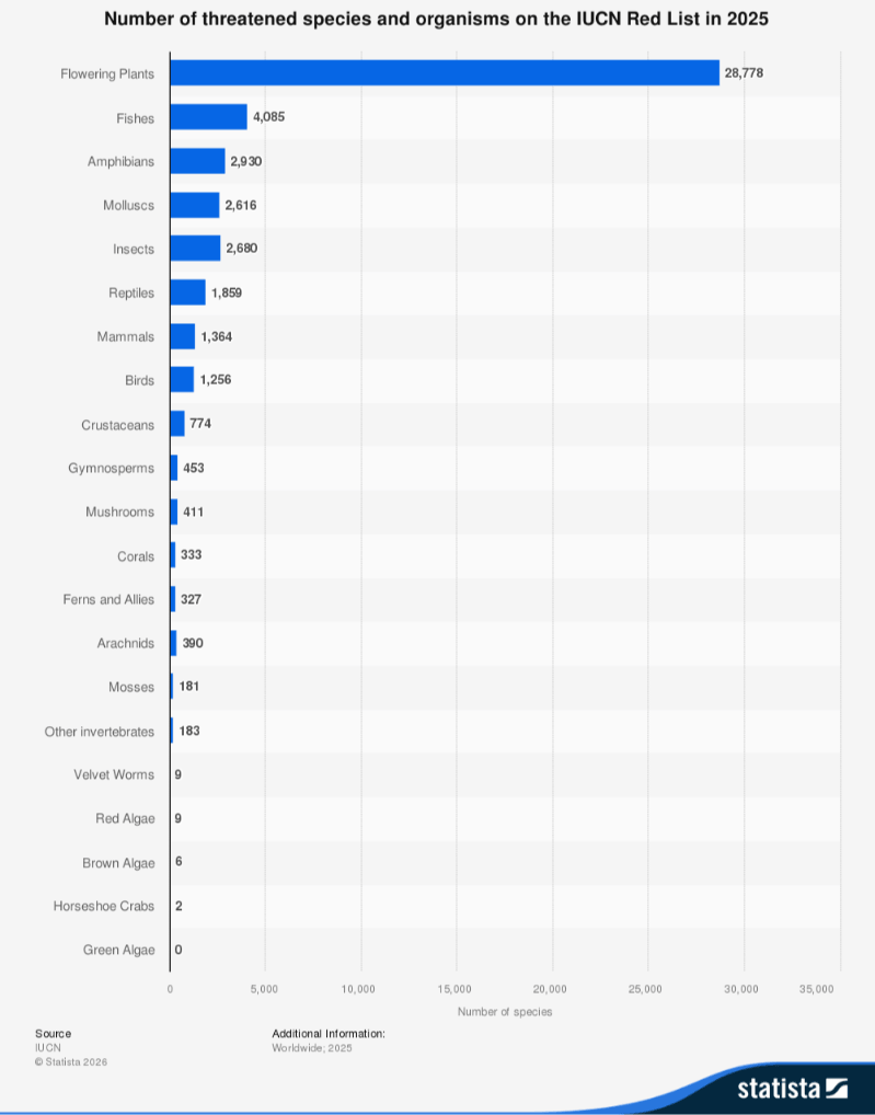 Entre los grupos más exhaustivamente evaluados (con al menos el 80% de sus especies estudiadas), las cícadas encabezan la lista con un 71% de sus especies en riesgo. Les siguen los corales formadores de arrecifes (44%), los anfibios (41%) y un grupo selecto de plantas dicotiledóneas como los cactus (38%). Los mamíferos, entre los que se incluye el ser humano, presentan un 27% de especies amenazadas, mientras que las aves alcanzan el 11,5%.