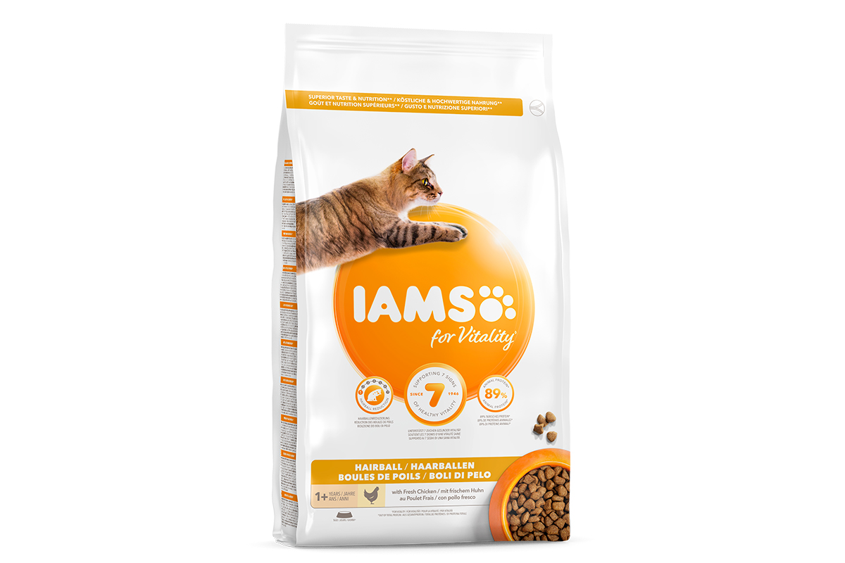 Ejemplo de ello es IAMS for Vitality Hairball Reduction "reducción de bolas de pelo" para gatos adultos y senior, una nutrición experta 100% completa y equilibrada que contribuye a los 7 signos de una saludable vitalidad y le ayuda con la incomodidad producida por las bolas de pelo.