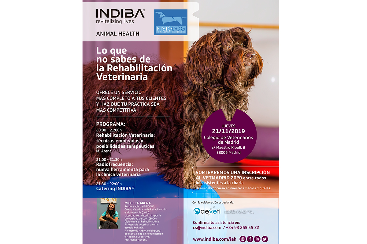 El próximo 21 de noviembre en el Colegio Oficial de Veterinarios de Madrid, la compañía INDIBA® Animal Health y FisioDog, junto con la Asociación Española de Veterinarios Especialistas en Rehabilitación y Fisiatría (Aevefi), celebran una charla para acercar la rehabilitación veterinaria a todos los veterinarios que quieran. Con el título "Lo que no sabes de la rehabilitación veterinaria", el objetivo del evento es que todos los asistentes puedan descubrir de primera mano las grandes ventajas que ofrece el servicio de rehabilitación en la práctica diaria en los tratamientos traumatológicos.