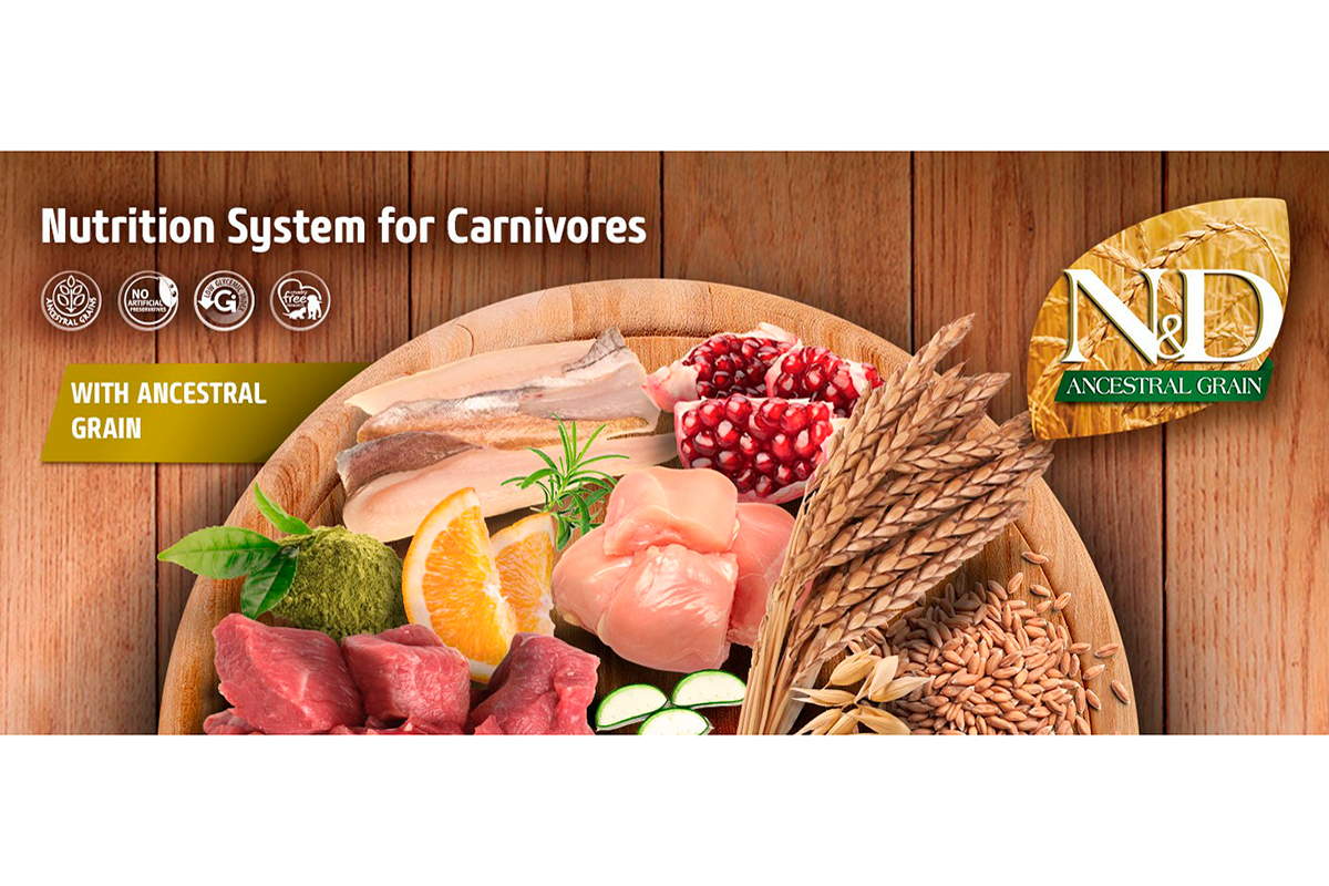 La gama N&D Ancestral Grain de Farmina se caracteriza por un total de 13 variedades que cubren las necesidades de gatos y perros, desde cachorros a adultos, presentándose 10 de estas variedades en formato seco y 3 como alimento húmedo.