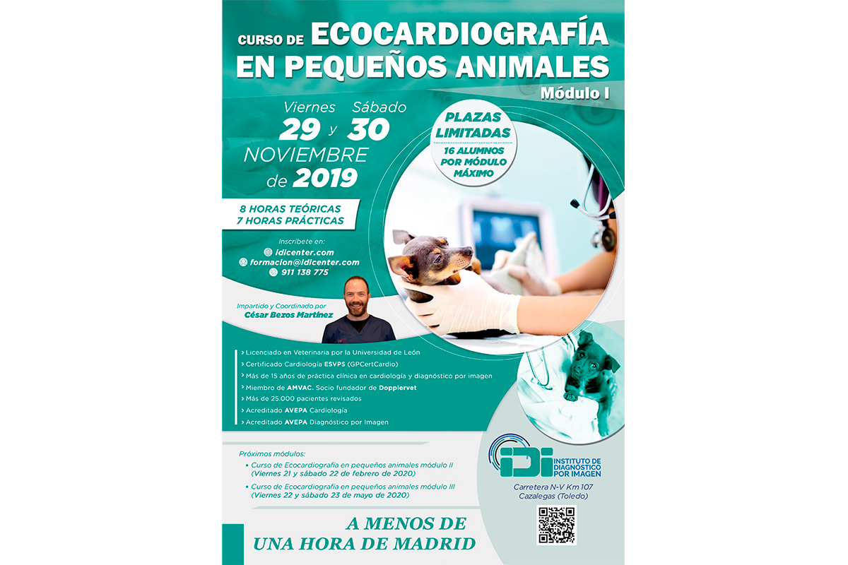 El Instituto de Diagnóstico por Imagen (IDI) ultima los detalles del `Curso de Ecocardiografía en Pequeños animales´, que se celebrará próximamente. Dividido en tres módulos, la formación está dirigida a veterinarios clínicos interesados en el campo de la cardiología y el diagnóstico por imagen que quieran reforzar y ampliar conceptos sobre esta materia.
