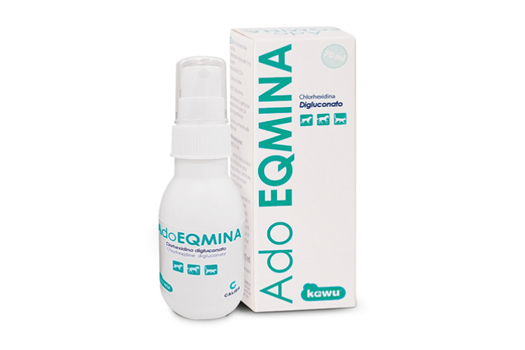 Ado EQMINA 70ml es el único producto de este tipo que está registrado como medicamento de veterinaria y está compuesto por un 1% de clorhexidina 10mg/ml, composición que proporciona una acción bactericida de amplio espectro que, a su vez, facilita una aplicación ideal para la piel de los animales de compañía.