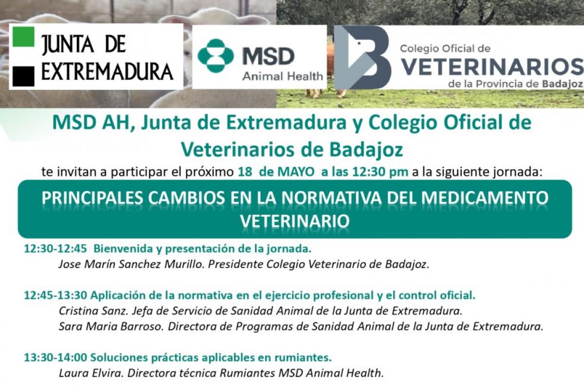 El próximo día 18 de mayo, y a las 12:30 horas, el Colegio Oficial de Veterinarios de Badajoz, MSD AH y la Junta de Extremadura, van a celebrar en el Salón de Actos de nuestra Sede Colegial una Jornada Técnica titulada: "Principales cambios en la normativa del medicamento veterinario".