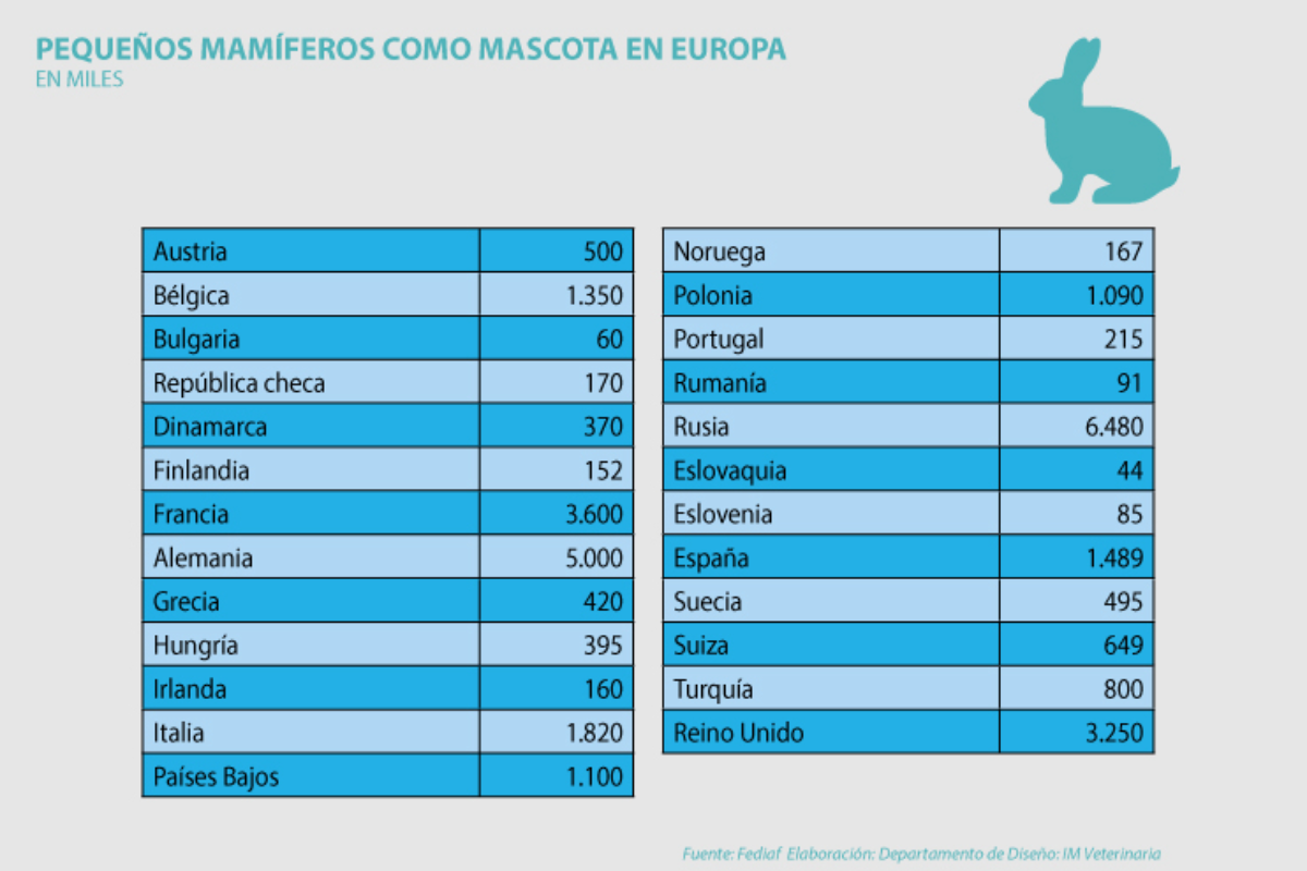 En el caso de España, se contabiliza una población de 1,5 millones de lagomorfos y roedores. La cifra, teniendo en cuenta la población del país, es inferior a la de sus socios del centro de Europa. Sin embargo, los pequeños mamíferos triunfan más en España que en el resto de los países del sur. En Portugal, la cifra es prácticamente testimonial, con 215.000 individuos viviendo en los hogares portugueses. Algo parecido sucede en Grecia, donde se contabilizan 420.000 pequeños mamíferos. Tampoco son amantes de los lagomorfos y los roedores los países eslavos. A modo de ejemplo, solo se contabilizan 85.000 pequeños mamíferos en Eslovenia.