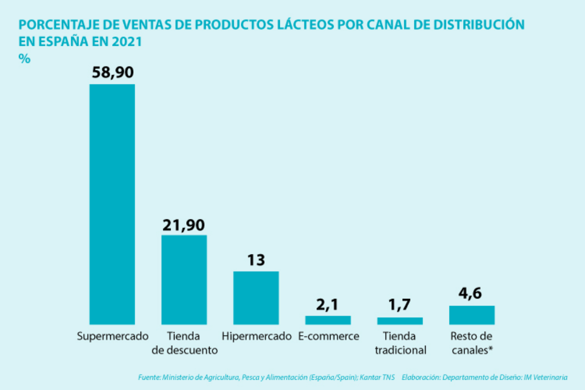 Según el informe del Ministerio de Agricultura, Pesca y Alimentación el 58,9% de los derivados lácteos se compraron en supermercados. El 21,9% se vendieron en tiendas de descuento. Las tiendas de descuento se caracterizan por tener un número de productos limitados de alimentación y droguería, apostando mucho por la marca propia. Algunos ejemplos serían el DIA, Lidl, Aldi o Condis.