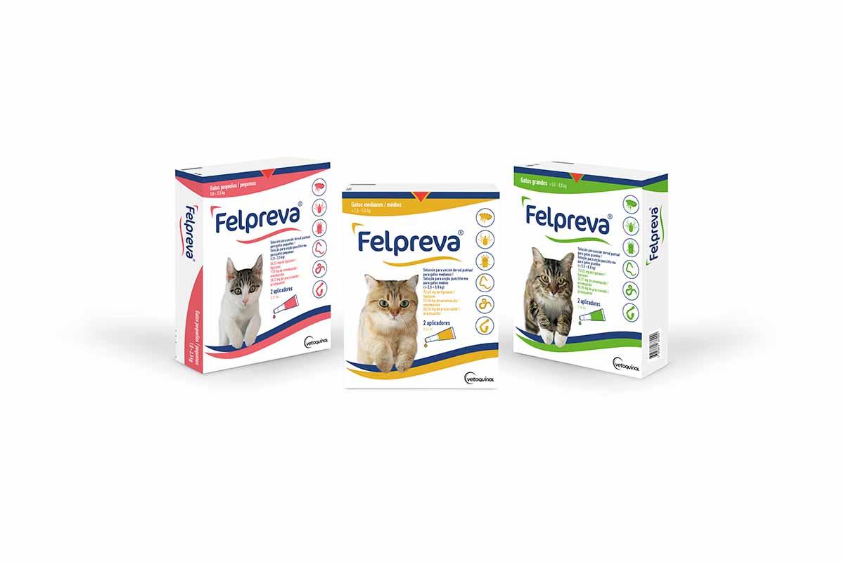Felpreva está disponible en presentaciones para gatos pequeños, medianos y grandes en envase de 2 pipetas y de 10 pipetas.
