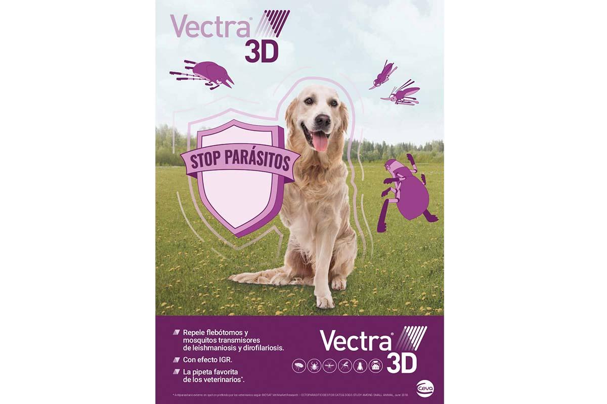 Ceva Salud Animal presenta un nuevo folleto informativo para la clínica veterinaria sobre la protección que ofrece frente a los parásitos externos en perros Vectra® 3D, la pipeta favorita de los profesionales veterinarios, que repele flebótomos y mosquitos transmisores de leishmaniosis y dirofilariosis. Además, gracias a que contiene un IGR (Insect Growth Regulator), protege el hogar de las pulgas eliminando sus huevos y larvas durante dos meses.