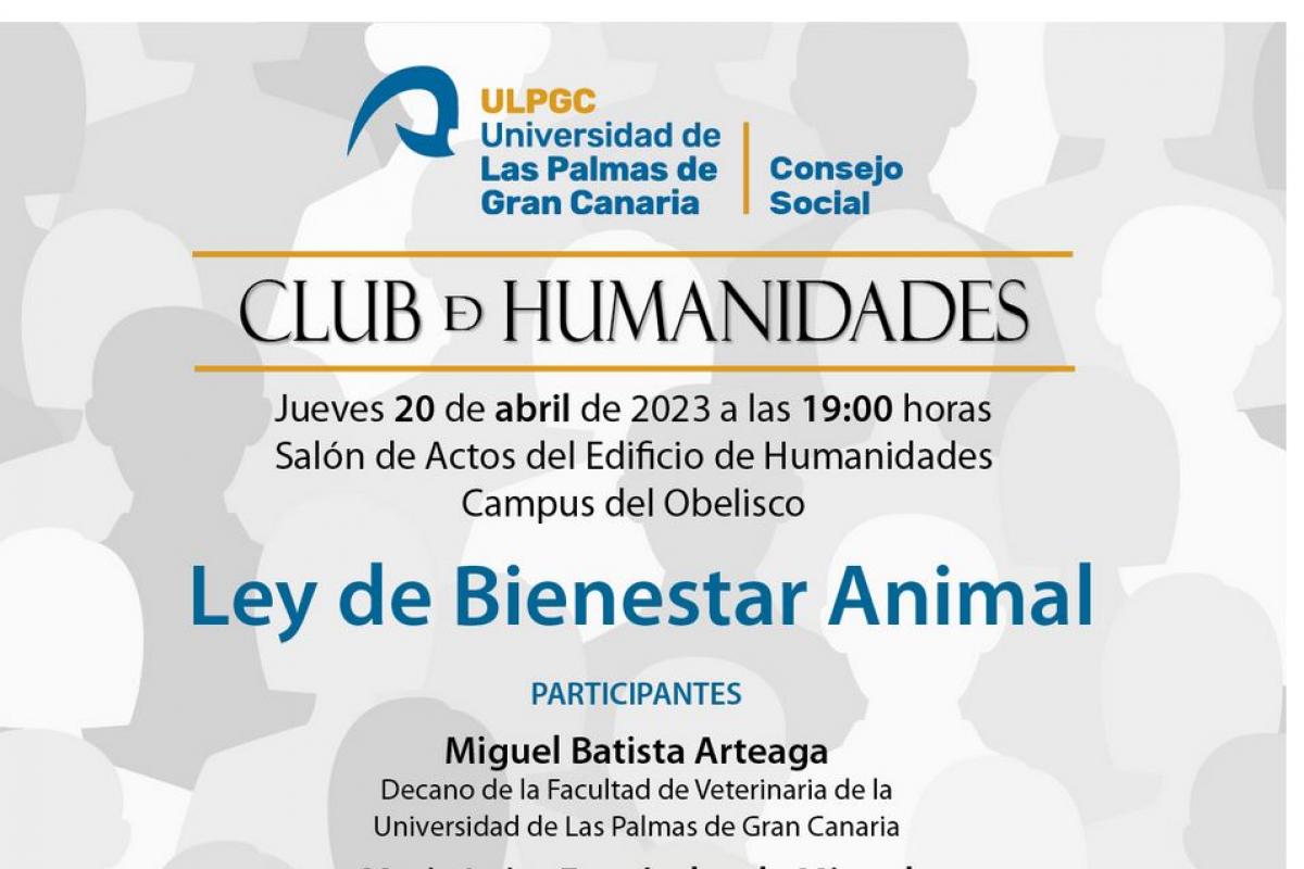El primer tema de debate será la Ley de Bienestar Animal (Ley 7/2023, de 28 de marzo, de protección de los derechos y el bienestar de los animales), una norma que llega acompañada de una reforma del Código Penal para agravar las penas del delito de maltrato animal. Este primer debate del Club de Humanidades, abierto al público general, se celebrará este jueves, 20 de abril, a las 19:00 horas, en el Salón de Actos del Edificio de Humanidades en el Campus del Obelisco, en Las Palmas de Gran Canaria.